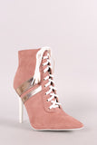 These sporty booties feature a pointy toe silhouette, front lace-up design, and stripes detailing. Finished with a slightly cushioned insole and side zipper closure.