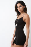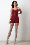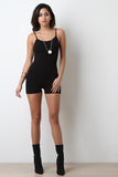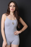 This stretchy romper features a scooped neckline, sleeveless construction, spaghetti shoulder straps, shorts bottom, scooped back and a sculpture fit. Accessory sold separately. Made in U.S.A. 95% Cotton, 5% Spandex.