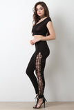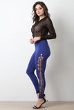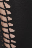 These sexy jersey knit leggings feature an elasticized waistband, high waisted, stretchy sculpture fit, taper cut legs and braided cutout constructed sides. Accessories sold separately. Made in U.S.A. 94% Cotton, 6% Spandex.