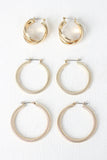 This earring set features three pairs of earrings. Hoop one is a glossy finish with a twisted design, hoop 2 is textured hoops that are medium sized, and hoop three is textured as well with larger hoops.