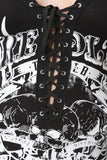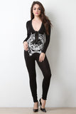 This lightweight jumpsuit features a jersey knit fabrication, scoop v-neckline with grommets with corseting lace-up detail at front, graphic print design at front, long sleeves, and a sculpture fit. Finished with a back cutout design, single button closure at nape, and taper cut legs. Accessory sold separately. Made in U.S.A. 95% Cotton, 5% Spandex.