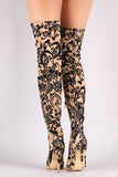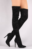 These stylish boots feature a stretchy mesh underlay with an intricate fleur-de-lis patterned detailing, pointy toe silhouette, and wrapped stiletto heel. Finished with a lightly cushioned insole and partial side zipper closure for easy on/off.