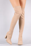 These over-the-knee boots feature a slightly stretched elastane shaft, covered chunky heel, pointed toe, and easy pull-on construction. Cushioned insole for comfort.