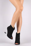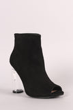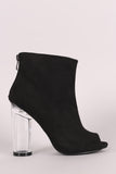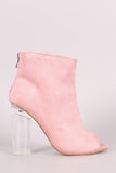 These ankle boots feature a soft vegan suede upper, peep toe silhouette, and back zipper closure. Finished with a cushioned insole, soft lining, and round perspex heel.