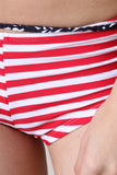 This bikini set features stars and stripes prints, soft padded foam cups, scallop edges, underwire, self-tie halter straps, and an s-hook back closure. Bikini bottom features a low rise boy shorts design, braided stars belt d�cor, and fully lined. Accessory sold separately. 80% Nylon, 20% Spandex. Lining: 100% Polyester.